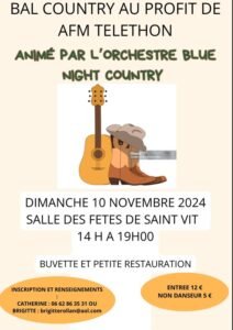Bal Country au profit du Téléthon, avec Concert des *Blue Night Country*, de 14h00 à 19h00, Salle des Fetes de Saint Vit (25), Doubs.