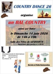 Le Dimanche 14 Juin 2026, Après Midi Bal Country animée par *Didier*, de 14h00 à 19h00, Salle des Fetes de Genissieux (26750), Drôme.