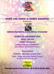 Le Samedi 23 Novembre 2024, Journée Line Dance à partir de 15h00, au Gymnase Baumet , Allée Théophile Gautier, à Pierrelatte (26700), Drome.