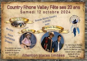 Le Samedi 12 Octobre 2024, Journée Country de *Country Rhone Valley*, qui Fetera ses 20 ans, avec Après Midi Workshop de *Lilly West*, Grande Soirée Country avec Concerts de *Lilly West* en 1ere Partie et *Mariotti Brothers*, au Dancing *Le B