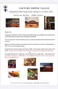 Le Dimanche 11 Mai 2025, Journée Country des *Country Rhone Valley*, chez *Jean Louis Saloon*, de 11h00 à 18h00, Chemin des Marihes, à Valence (26000), Drome.