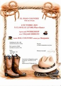 Le Samedi 04 Octobre 2025, Journée Country à partir de 14h00, chez *El Paso Country*, qui Fetera ses 10 ans, avec Workshop de *Chrystel Arreou* et Bal Country animé par *Benjamin * , Place Bance, à Claville (2718