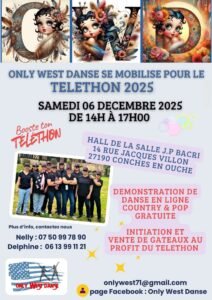 Le Samedi 06 Décembre 2025, Après Midi Bal Country pour le Téléthon, chez *Only West Danse*, de 14h00 à 17h00, Hall de la Salle J.P Bacri, 14 rue Jacques Villon, à Conches en Ouche (27190),