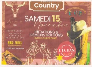 Le Samedi 15 Novembre 2025, Soirée Country avec Initiations et Démonstrations, à partir de 19h00, à * L’Ecran Resto Bar*, Les Loges, rue du Haut des Granges, à Courbépine (27300), Eure.
