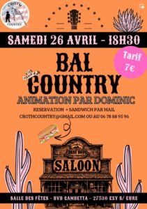 Le Samedi 26 Avril 2025, Bal Country animé par *Dominic*, à 18h30, Salle des Fetes Boulevard Gambetta, à Ezy sur Eure (27530), Eure.