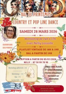 Le Samedi 28 Mars 2026, Journée Country et Pop Line Dance avec Workshop de *Nelly Lassale*de 14h00 à 17h00 , Playlist Vintage de 18h00 à 19h00 et Bal à 19h00, Salle Polyvalente de Buis sur Damville, Impasse des Thuyas, à Mesnils sur Iton (27240), Eure.