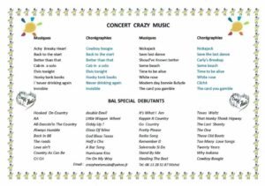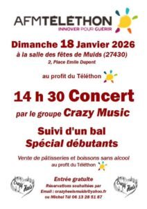 Le Dimanche 18 Janvier 2026, Après Midi Country Concert pour le Téléthon, avec le groupe *Crazy Music*, à 14h30, suivi d’un Bal Débutants, Salle des Fêtes , 2 Place Emile Dupont, à Muids (27430), Eure.