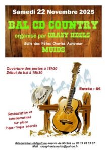Le Samedi 22 Novembre 2025, Bal Country cd chez *Crazy Heels*, à 19h30, Salle des Fetes Charles Asnavour, à Muids (27) , Eure.