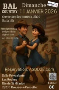 Le Dimanche 11 Janvier 2026, Après Midi Bal Country à 14h00, Salle Polyvalente Les Roches, Route de St Hilarion, à Droue sur Drouette (28230), Eu