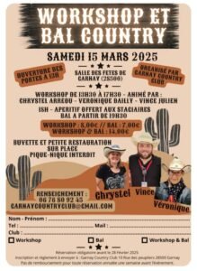 Le Samedi 15 Mars 2025, Journée Country de *Garnay Country Club*, à partir de 13h30, avec Workshop et Bal Country, Salle des Fetes de Garnay (28500), Eure et Loir.