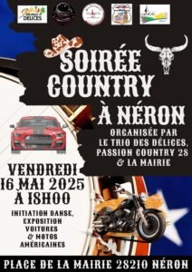 Le Vendredi 16 Mai 2025, Soirée Country orgaisée par *Le Trio des Délices*, *Passion Country 28* et la Mairie , à 18h00, avec Initiation Danse, Exposition voitures et motos americaines, Place de la Mairie à Néron (28210), Eure et Loir.
