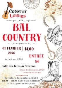 Le 1er Février 2026, Après Midi Bal Country animé par *Edith*, à 14h00, Salle des Fetes Ar Sterenn, 40 rue des Fontaines, à Chateauneuf du Fao