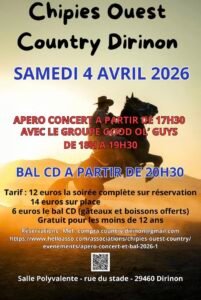 Apéro Concert des *Chipies Ouest Country*, avec *Good Ol’ Guys de 18h00 à 19h30 et Bal Country cd à 20h30, Salle Polyvalente , rue du Stade, à Dirinon (29460)