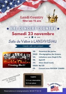 Le Samedi 23 Novembre 2024, Bal Concert Country des *Landi Country*, qui Feteront leurs 15 ans, à partir de 15h00, avec un Bal Country Concert des *Rockin’Chairs Country Music* à 20h30, Salle du Vallon, à Landivisiau (29400), Finistère.