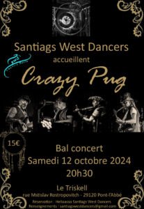 Le Samedi 12 Octobre 2024, Bal Country Concert des *Santiags West Dancers*, animé par *Crazy Pug*, à 20h30, *Le Triskell*, rue Mstislav Rost