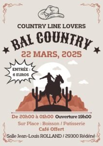 Le Samedi 22 Mars 2025, Bal Country des *Country Line Lovers*, de 20h00 à 01h00, Salle Jean Louis Rolland, à Rédéné (29300), Finistere.