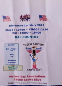 Le Dimanche 1er Mars 2026, Journée Country des *Totem Dancers Ste Sève*, de 10h00 à 19h00, avec Stage et Bal , Maison des Associations, à Sainte Sève (29600), Finis