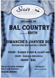 Le Dimanche 05 Janvier 2025, Journée Country des *Scaer Country*, animée par *Edith*, à partir de 10h00, avec Danses D’Hier et Avant Hier, auberge Espagnole, Bal à 14h00, Espace Youenn Gwernig,rue Louis Pasteur, à Scaer (2939
