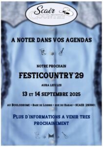 Les 13 et 14 Septembre 2025, Week End Festicountry chez *Scaer Country*, au Boulodrome, Base de Loisirs, rue du Haras, à Scaer (29390), Finistère.