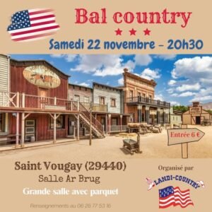 Le Samedi 22 Novembre 2025, Bal Country chez *Landi Country*, à 20h30, Salle Ar Brug, à St Vougay (29440), Finistère.
