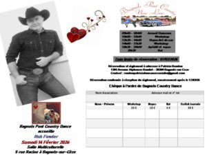 Le Samedi 14 Février 2026, Journée Country à partir de 10h00, avec Workshop de *Rob Fowler*, Repas, Apéritif, Bal à 20h30, Salle Multiculturelle, 5 rue Racine, à Bagnols sur cèze (30200), Gard.