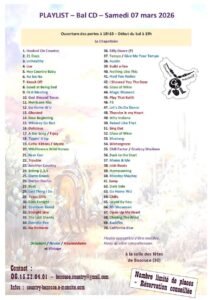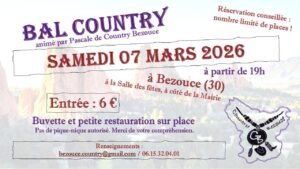 Le Samedi 07 Mars 2026, Bal Country animé par *Pascale de *Country Bezouce*, à 19h00, Salle des Fêtes, à Coté de la Mairie de Bezouce (30), Gard.
