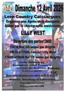 Le Dimanche 12 Avril 2026, Après Midi Bal Country à partir de 13h30, avec Concert de *Lilly West* de 14h30 à 17h00, Salle Aldébaran, Complexe St Exupéry , Avenue de la Dame, à Caissargues (
