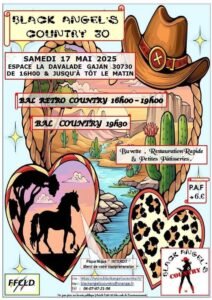 Le Samedi 17 Mai 2025, Journée Country de 16h00 à Tot le matin, chez *Black Angels Country 30*, Espace La Davalade, à Gajan (30), Gard.