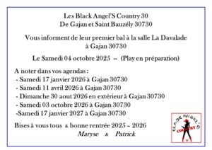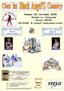 Le Samedi 04 Octobre 2025, Soirée Country de 17h00 à Tard dans la nuit, chez *Les Black Angel’s Country*, Espace La Davalade, à Gajan (30730), Gard.