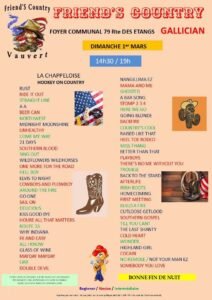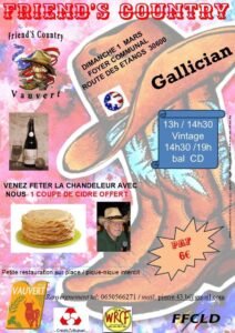 Le Dimanche 1er Mars 2026, Après Midi Bal Country des *Fiend’s Country Vauvert*, de 14h30 à 19h00, Foyer Communal, Route des Etangs, à Gallician (30600), Gard.