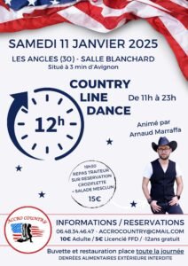Le Samedi 11 Janvier 2025, Journée Country Line Dance de (12h), animée par *Arnaud Marraffa *, chez *Accro Country*, de 11h00 à 23h00, Salle Blanchard, à 3 minutes D’Avignon, Les Angles (30), Gard.