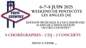 Du 06 au 08 Juin 2025, Week End Festi’Country , Edition Spéciale pour les 10 ans *D’Accro Country* , avec 9 Chorégraphes, 2 DJ, 2 Concerts, pour la Pentecote, Les Angles