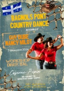 Le Samedi 07 Décembre 2024, Journée Country Line Dance de *Bagnols Pont Country Dance*, avec Workshop de *Guy Dube* et *Nancy Milot*, suivi d’un Diner Bal, Caserne Pépin, Boulevard Gambetta, à Pont dt Esprit (30130), Gard.