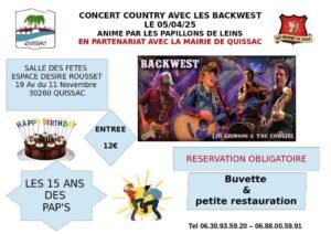 Le Samedi 05 Avril 2025, Soirée Country animée par *Les Papillons de Leins*, avec Concert des *Backwest*, pour Feter les 15 ans des Pap’s, Salle des Fetes , Espace Désiré Rousset, 19, Avenue du 11 Novembre , à Quissac (