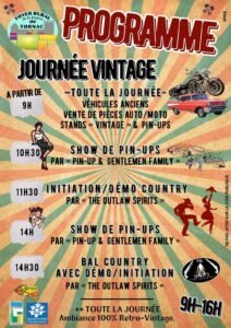 Toute la journée venez vous plonger dans l’univers Rétro/Vintage avec un Florilège de Véhicules anciens (auto et moto). Sans oublier les pin-up, de la country et du rock qui vous entraîneront le temps de cette journée dans un passé, pas si lointain!!