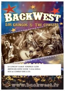Le Vendredi 13 Septembre 2024, Soirée Concert Country Gratuit des *Backwest Los Gringos & The Cowgirl*, à la 5ème édition de L’American Horse Show, à 21h00, au Cowboy Bar