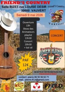 Le Samedi 09 Mai 2026, Journée Country des *Friend’s Country*, à partir de 13h30, avec Show des Animateurs, Playlist, Concert à 20h30 et Bal cd,
