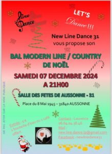 Le Samedi 07 Décembre 2024, Bal Modern Line et Country de Noel, chez *New Line Dance 31*, à 21h00, Salle des Fetes , Place du 08 Mai 1945, à Aussonne (31840), Haute Ga
