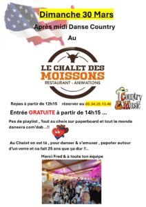 Le Dimanche 30 Mars 2025, Après Midi Bal Country, à partir de14h15, au Chalet des Moissons, à Balma (31) , Haute Garonne.