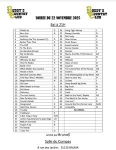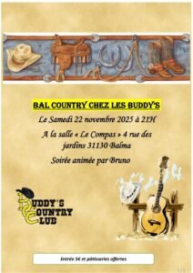Le Samedi 22 Novembre 2025, Bal Country chez *Les Buddy’s*, animé par *Bruno*, à 21h00, Salle *Le Compas*, 4 rue des Jardins, à Balma (31130), Haute Garonne.