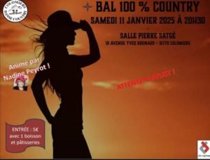 Le Samedi 11 Janvier 2025, Bal 100% Country animé par *Nadine Peyrot*, à 20h30, Salle Pierre Satgé, 10, Avenue Yves Brunaud, à Colomiers (31770), Haute Garonne.