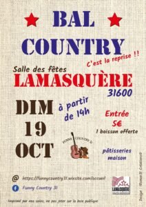 Le Dimanche 19 Octobre 2025, Après Midi Bal Country à 14h00, chez *Funny Country 31*, Salle des Fetes de Lamasquère ( 31600), Haute Garonne.
