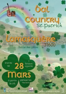 Le Vendredi 28 Mars 2025, Bal Country St Patrick à 21h00, Salle des Peces, à Lamasquère (31600), Haute Garonne.