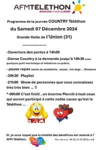 Le Samedi 07 Décembre 2024, Journée Country pour le Téléthon, à partir de 14h00, Grande Halle de L’Union (31), Haute Garonne.