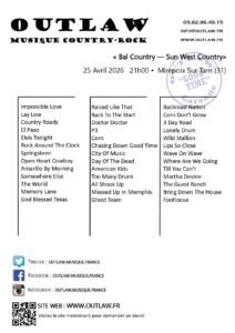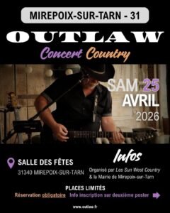 Le Samedi 25 Avril 2026, Bal Country des *Sun West Country*, avec Concert Country de *Outlaw*, à 21h00, Salle des Fêtes de Mirepoix sur Tarn (31) Haute Garonne.
