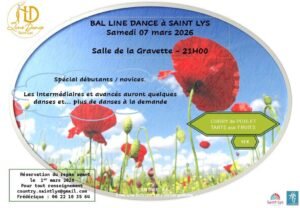Le Samedi 07 Mars 2026, Bal Line Dance chez *Country St Lys*, à 21h00, Salle de la Gravette, à Saint Lys (31), Haute Garonne.
