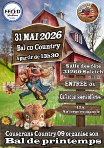 Le Dimanche 31 Mai 2026, Après Midi Bal Country cd de Printemps , à 13h30, chez *Couserans Country 09*, Salle des Fêtes de Saleich (31), Haure Garonne.
