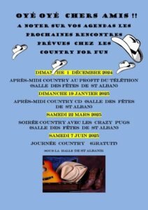 Le Dimanche 1er Décembre 2024, Après Midi Bal Country chez *Les Country For Fun*, Salle des Fetes de St Alban (31), Haute Garonne.