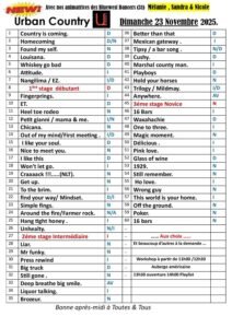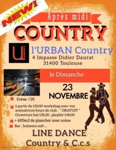 Le Dimanche 23 Novembre 2025, Après Midi Bal Country Line Dance et CCS, à partir de 11h00, avec Workshop, Bal à 13h30, Playlist à 14h00, sur 600 m² de plancher, chez *Urban Country* 4 Impasse Didier Daurat, à Toulouse (31400), Haute Garon