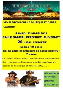 Le Samedi 22 Mars 2025, Bal Country avec Concert de *Turquoise*, à 20h00, Salle Gabriel Peronnet, au Vernet (31810), Haute Garonne.